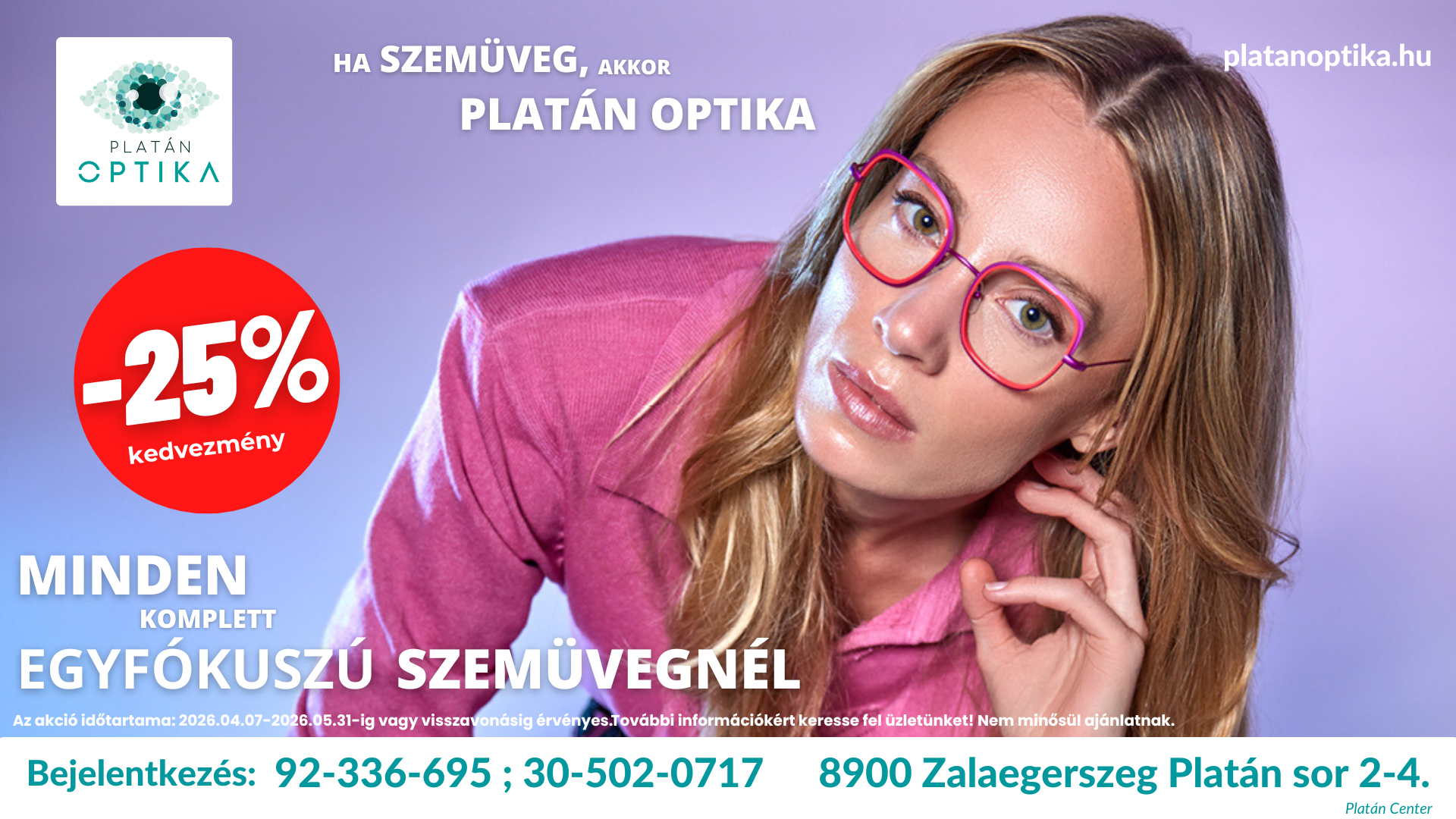 minden egyfókuszú komplett szemüveg vásárláskor a szemüveglencsékből 25% kedvezmény + minden szemüvegkeretre 25% kedvezmény